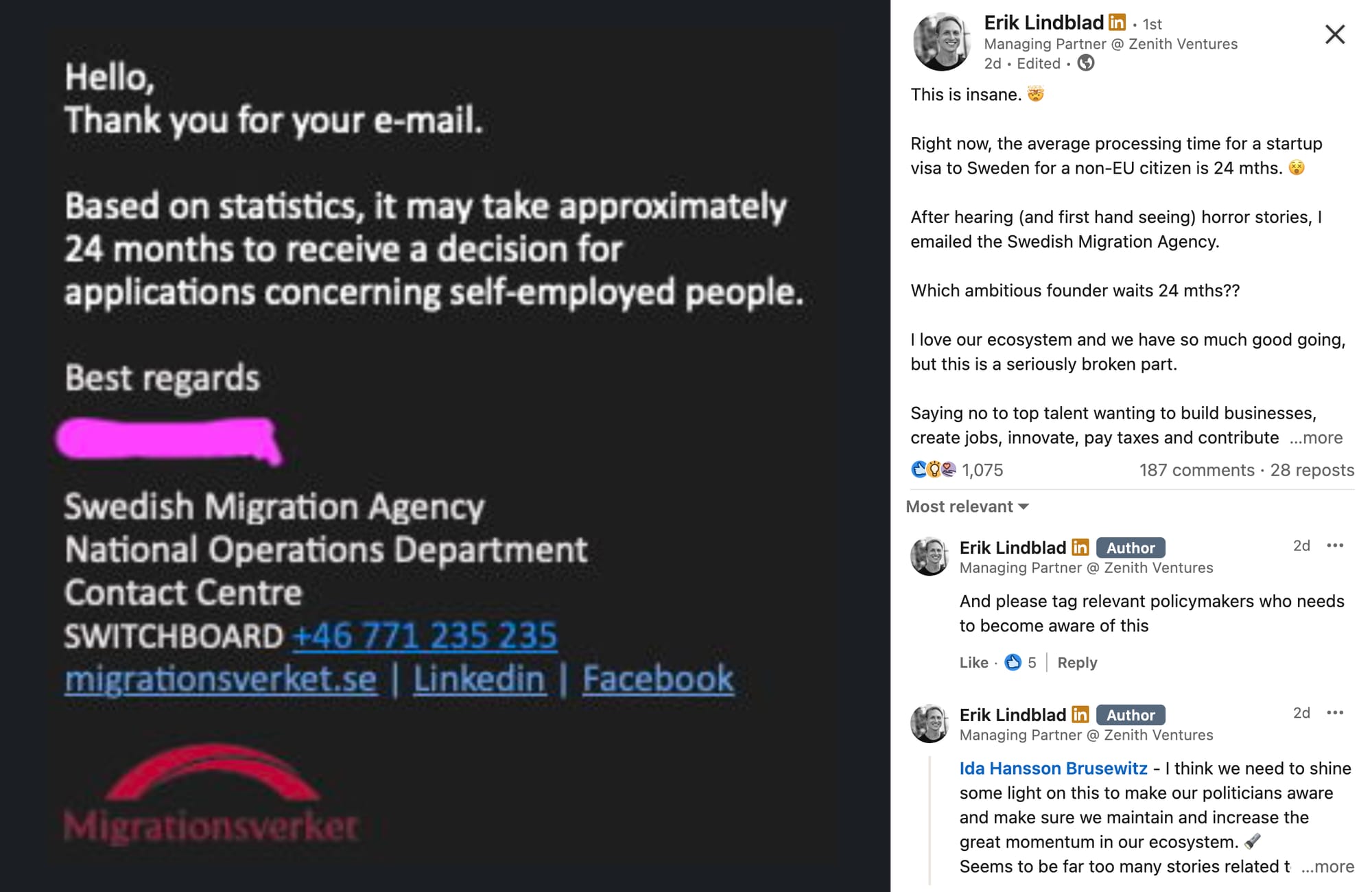 Earlier this month, Zenith Ventures' Erik Lindblad went viral on LinkedIn for an email exchange with Migrationsverket (the Swedish Migration Agency) regarding application processing times for startup founders.