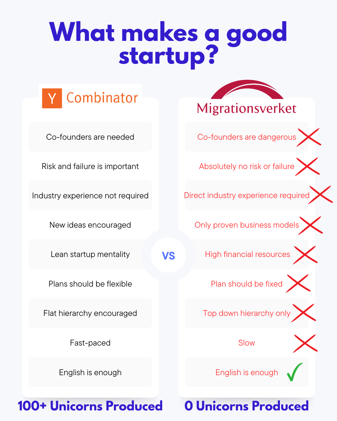 When Migrationsverket was asked what startup must meet, I was able to make a rough checklist: risk free, 51% ownership, turning a profit already, a strong strong business plan, proof you were successful in a similar company and so on. For someone unfamiliar with startups, this might seem like a good list; for someone familiar, it's a comedically bad list which contradicts what every good startup must have.